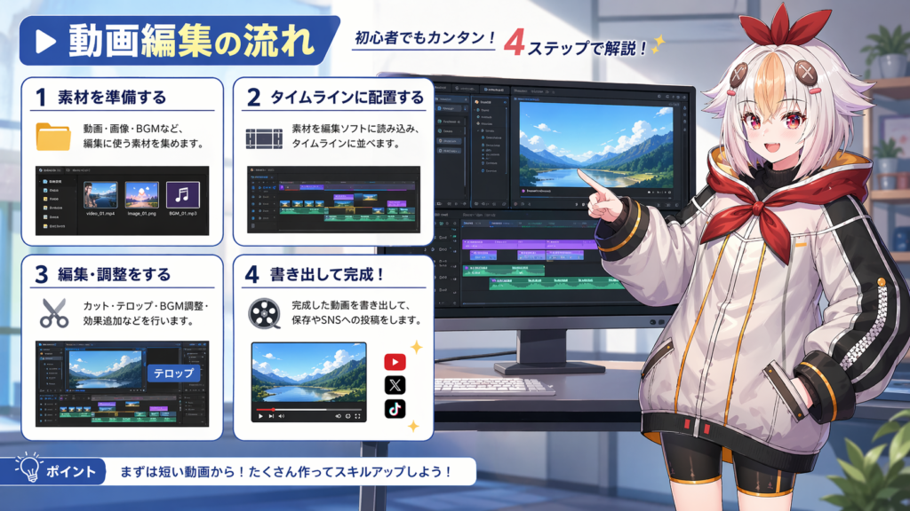 この記事で紹介した7つの操作を覚えれば、一本の動画を最初から最後まで作り切ることができます。